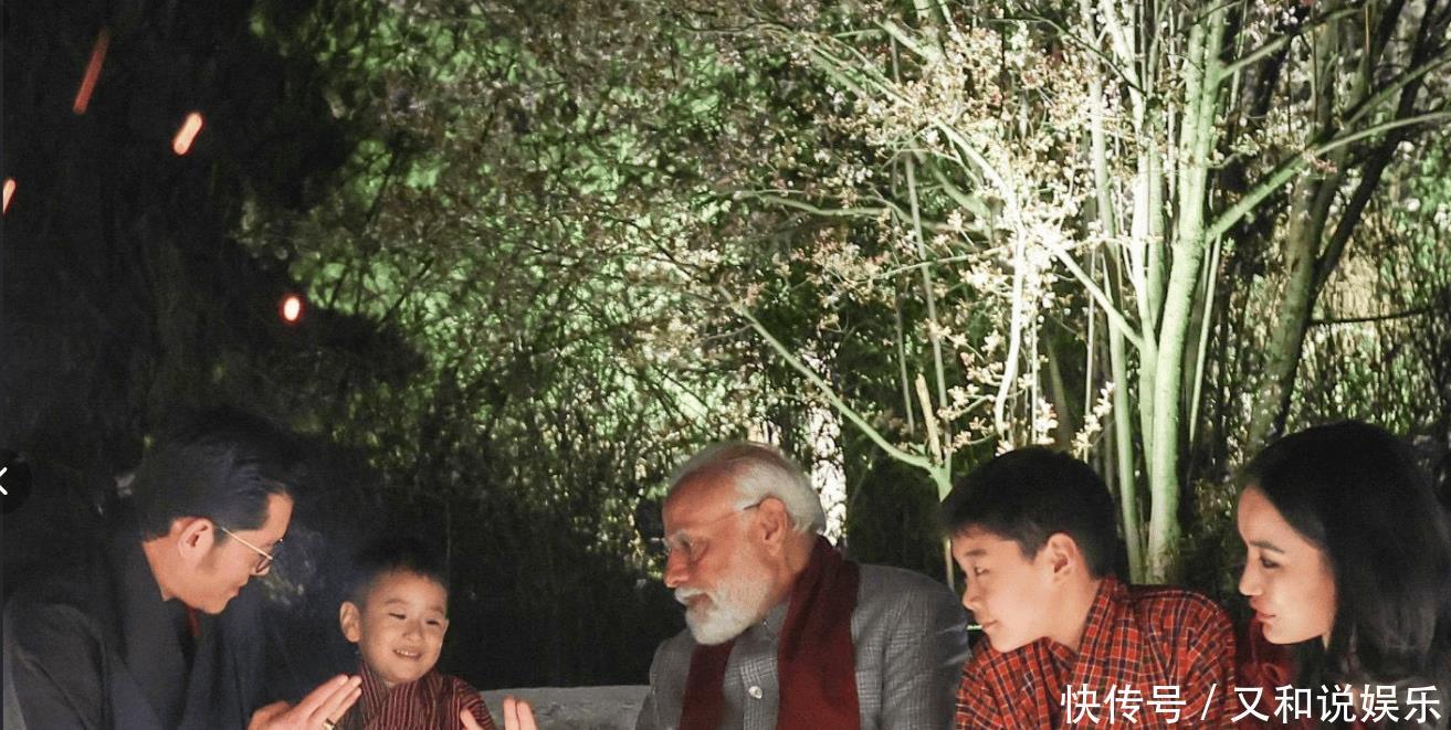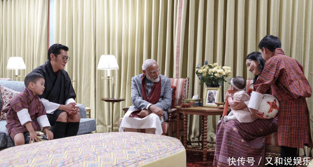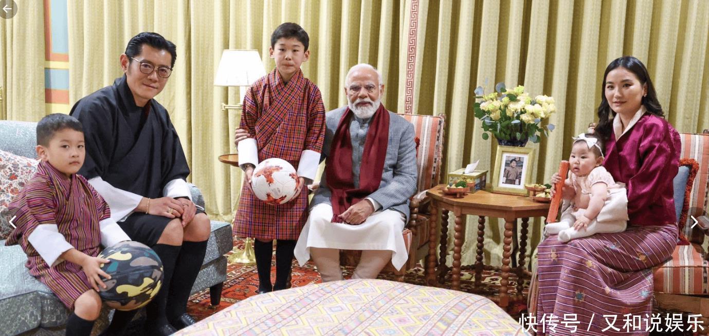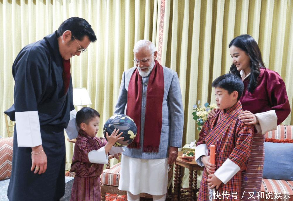 3月25日,不丹国王吉格梅·凯萨尔·纳姆耶尔·旺楚克邀请莫迪到家作客;夫人佩玛与三个孩子也都沿途出来管待,两个小王子还收到了礼物呢!