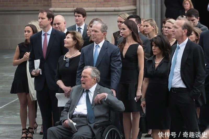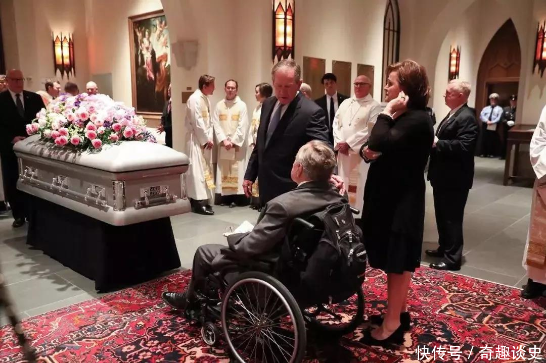这场葬礼上,老布什穿戴伶仃灰色西装,搭配着深蓝色领带,坐在轮椅上,由男儿小布什推到了芭芭拉的棺木前。